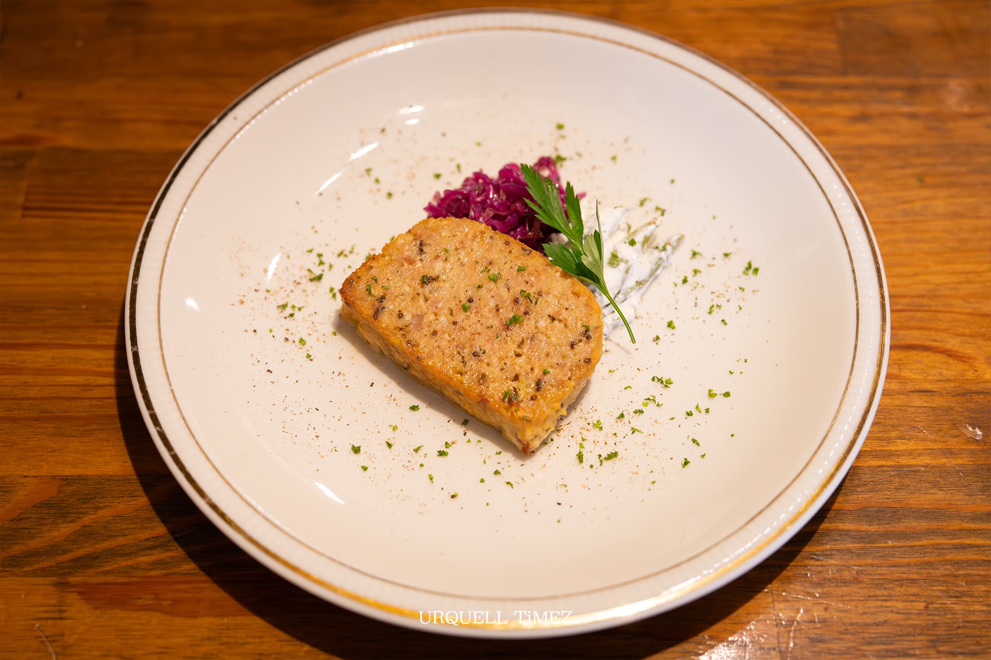 肉の旨味が詰まったミートローフのような一皿で、添えられたザワークラウトが良いアクセントになっています。