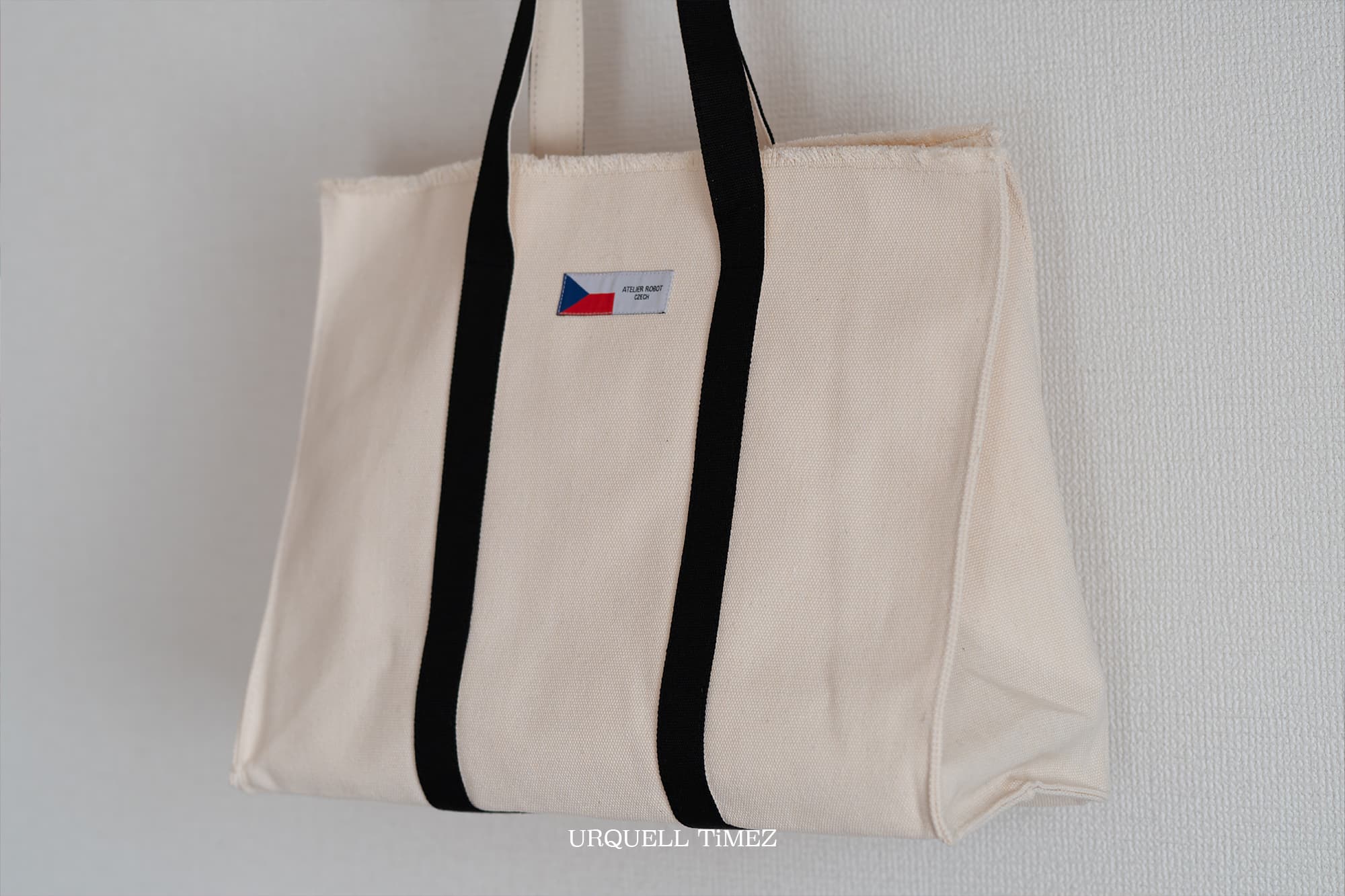 しっかりとしたキャンバス地で作られており、持ち手の黒とボディの白のコントラストがシンプルで良いですね。