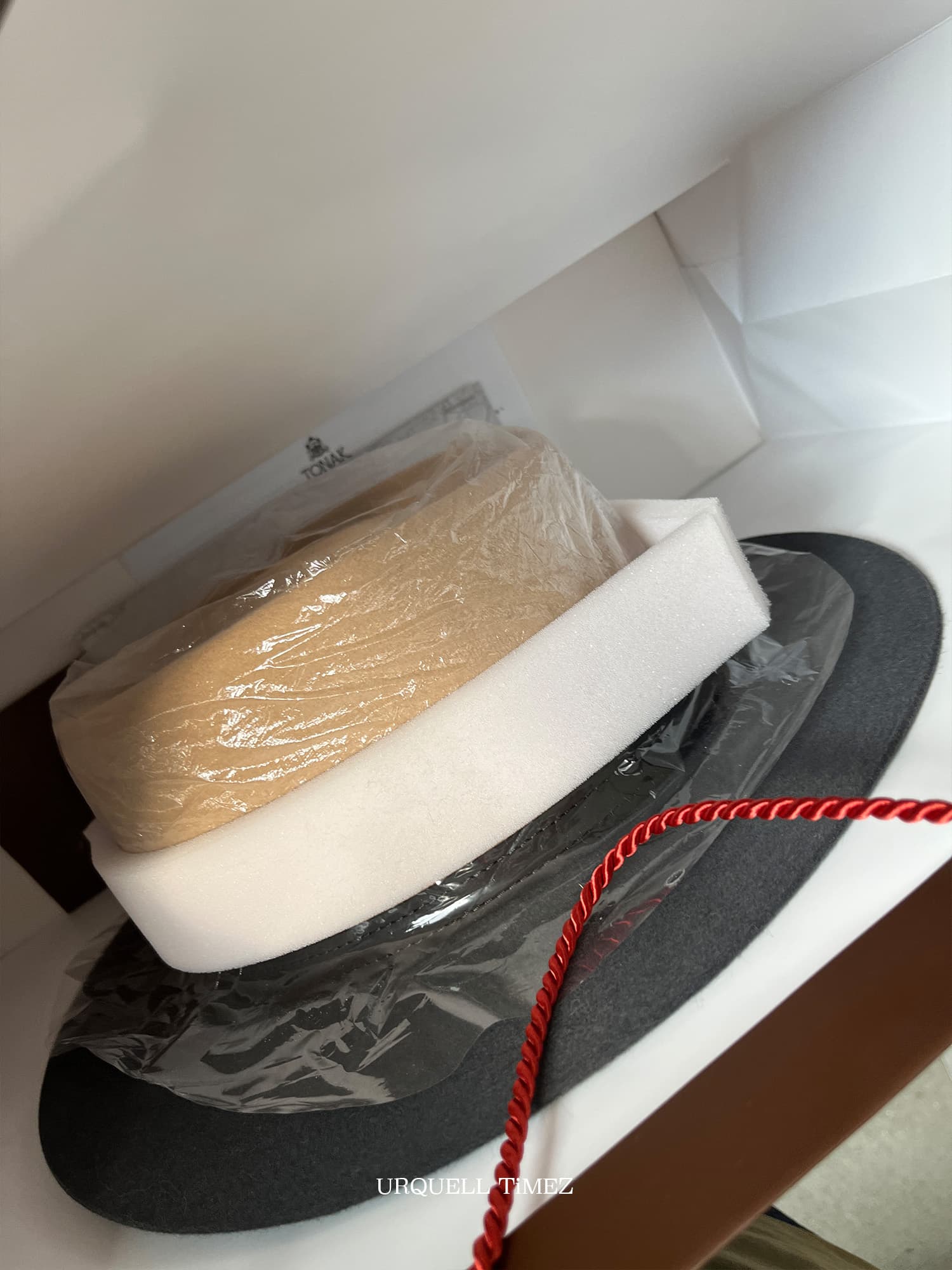 お店では、上の写真のように帽子の型崩れ用のスポンジや紙袋などを用意してくれますが、柔らかい素材なので飛行機は特に注意しましょう。